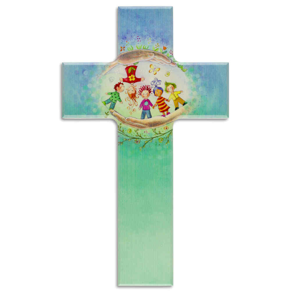 Kinderkreuz Kinder geborgen in Gottes Hand Holz bunt 15 x 9 cm Taufe Kommunion