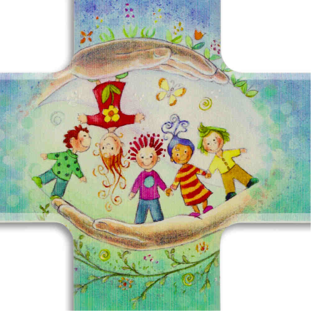 Kinderkreuz Kinder geborgen in Gottes Hand Holz bunt 20 x 12 cm Taufe Kommunion