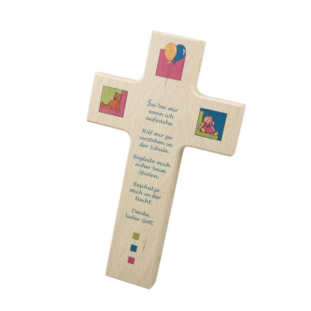 Bunt bedrucktes Wandkreuz für Kinder mit Spruch. Verziert ist das Kreuz mit süßen, bunten Kindermotiven. Verpackt in einer Klarsichthülle mit Karte ein schönes Geschenk zur Geburt, Taufe, Kindergeburtstag, Namenstag, Kommunion ...