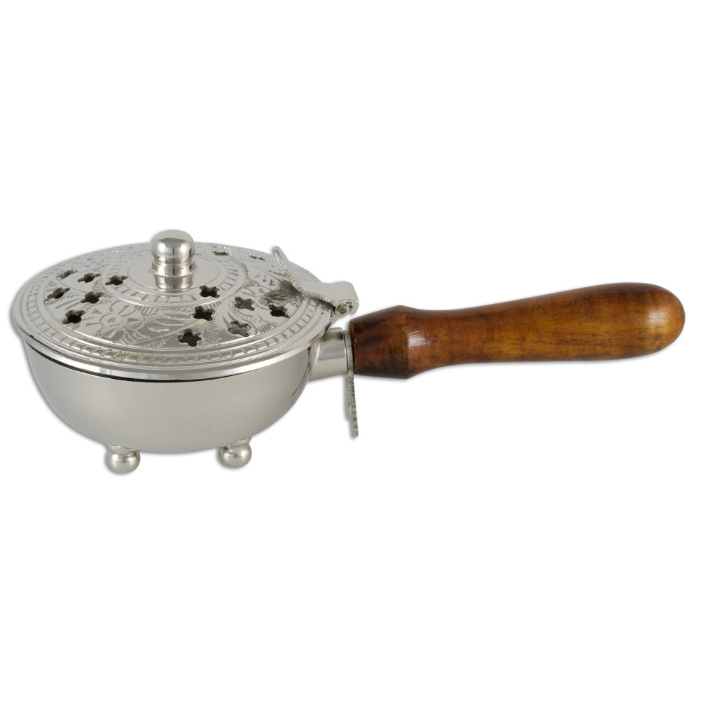 Edle Räucherpfanne in Messing vernickelt mit Schanier und Holzgriff. Dieses edle Rauchgefäß wurde in aufwendiger Handarbeit veredelt.