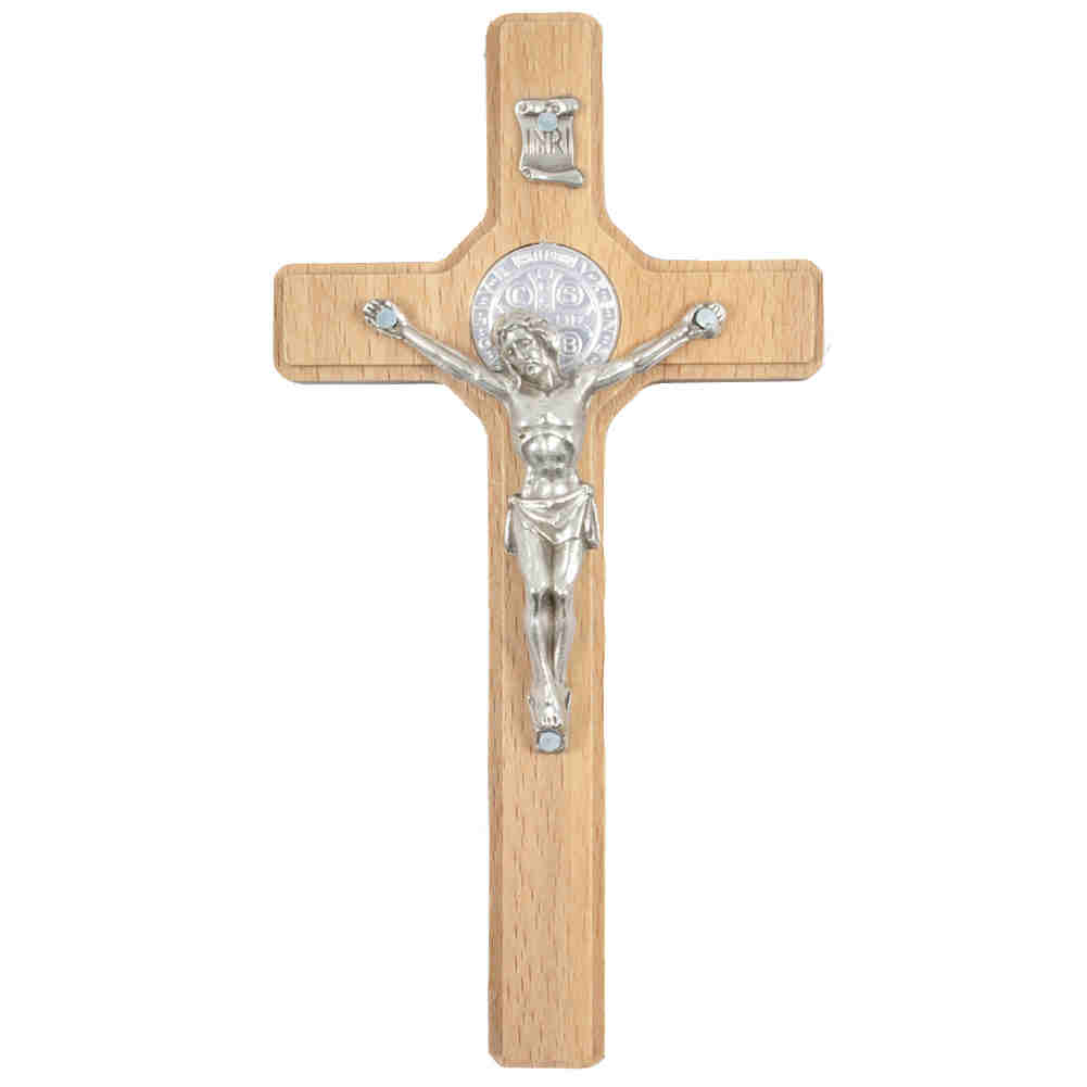 Ein edles Benediktuskreuz aus Naturholz. Verziert ist das Kreuz mit einer Medaille des Heiligen Benedikt und einem silberfarbenem Korpus.